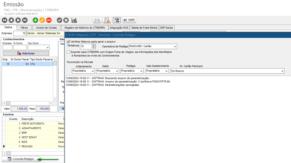 - Gerar via operadora de pedágio: habilita o campo Operadora de Pedágio.