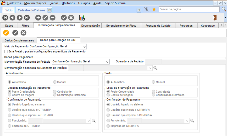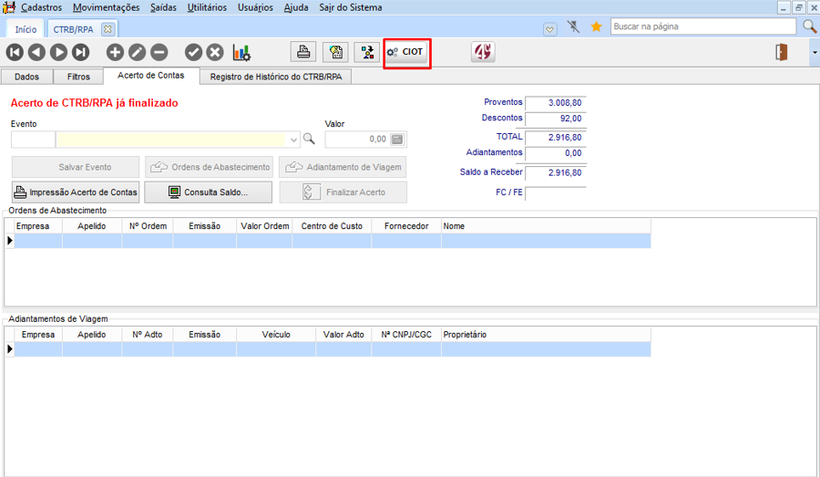 Após esse processo, deve-se encerrar o CIOT, pois somente é permitida uma alteração de valores, devido a configuração no perfil de usuário criada, não será mais possível alteração, pois evita a duplicação de valores na operação de pagamento eletrônico.