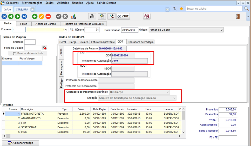 Após finalizada a viagem, devem ser retificados os valores no CTRB/RPA, informando por exemplo o valor do Combustível e demais valores como Frete Motorista. Para os impostos (IRRF, INSS, SEST/SENAT) o sistema calcula automático, assim realizando o acerto de contas do CTRB/RPA e gerando a fatura e títulos. O sistema envia novo arquivo para atualizar os valores a serem pagos para o valor agregado na NDD.