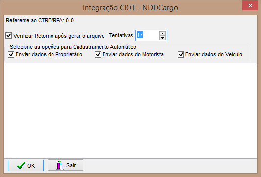 Na tela do programa de integração para geração dos arquivos de CIOT, a quantidade de tentativas fica gravada para um próximo usuário que acessar, isto era fixo anteriormente e caso demorasse o retorno, tinha que ser realizado novamente pelo botão CIOT.