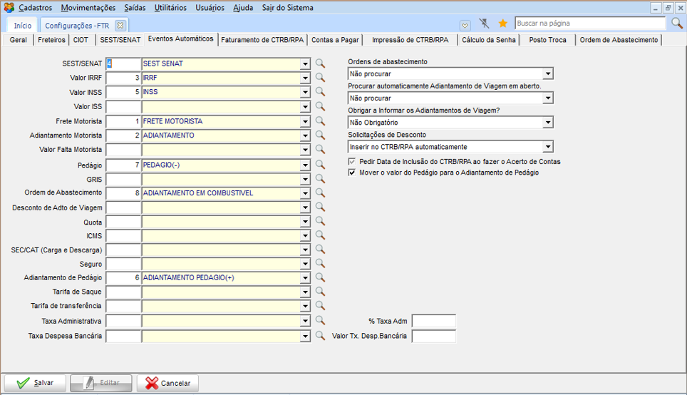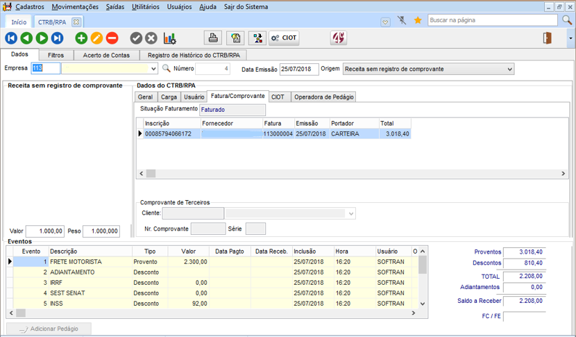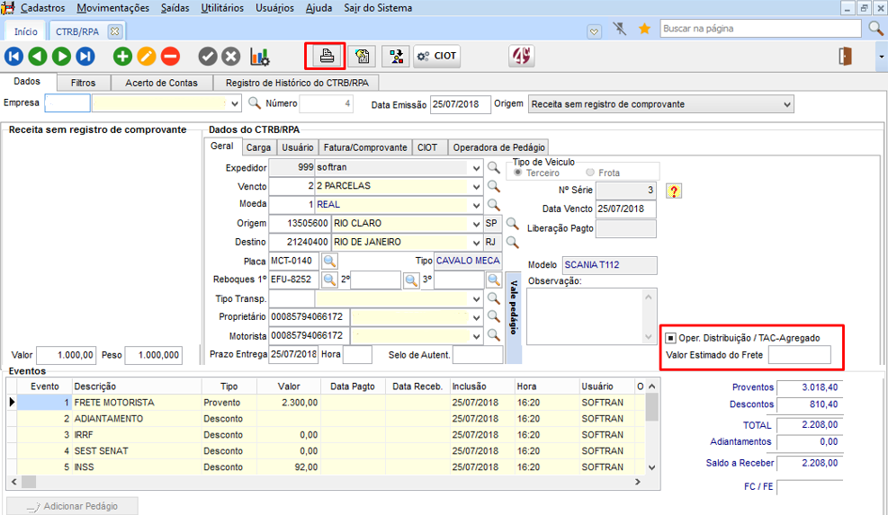 Para operações de viagem padrão, devem ser informados todos os valores antes de imprimir a CTRB/RPA, onde é gerada a fatura, títulos e CIOT.