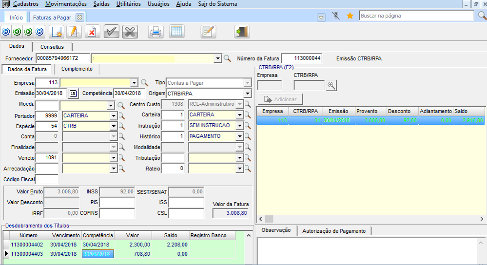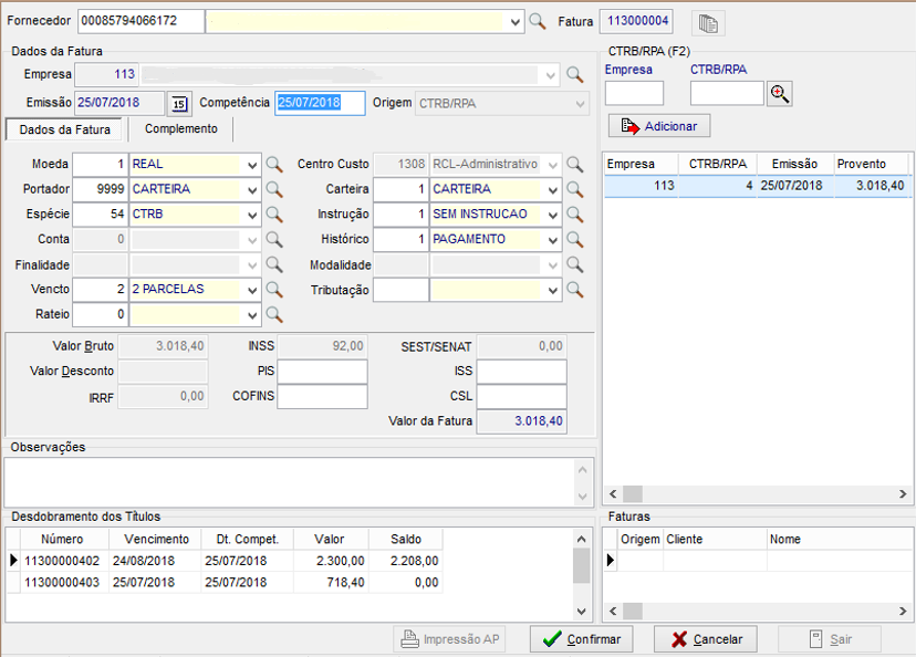 Na guia Dados mostra a fatura gerada e na subguia Dados do CTRB/RPA > Fatura/Comprovante com duplo clique abre para visualização da fatura e títulos.