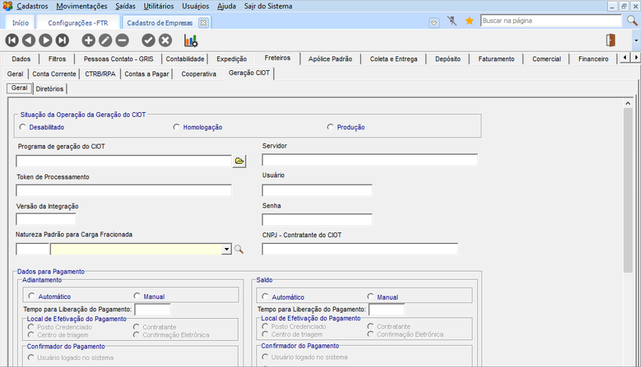 Em CFG > Cadastros > Empresas > Freteiros > Geração de CIOT, nas Guias Geral de Diretórios devem ser configurados os diretórios para integração com NDD.
