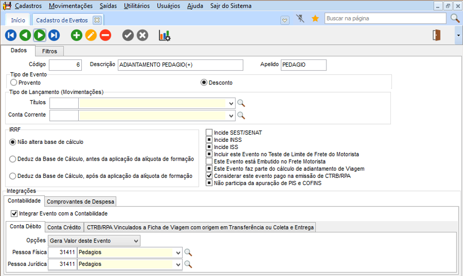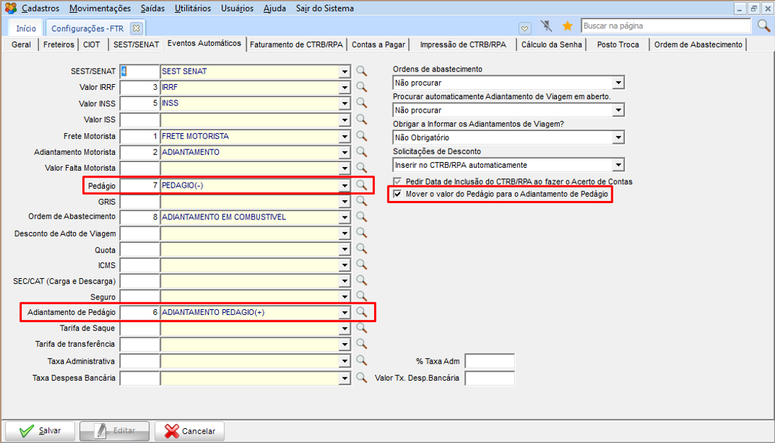 Eventos configurados para Pedágio e Adiantamento de Pedágio e configuração para mover o mesmo valor do Pedágio para o Adiantamento de Pedágio ao gerar o CTRB/RPA pela ficha de viagem.