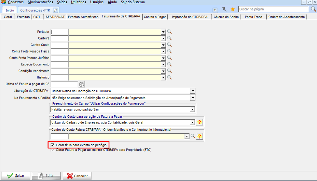 Opção para gerar título para o pedágio separadamente.