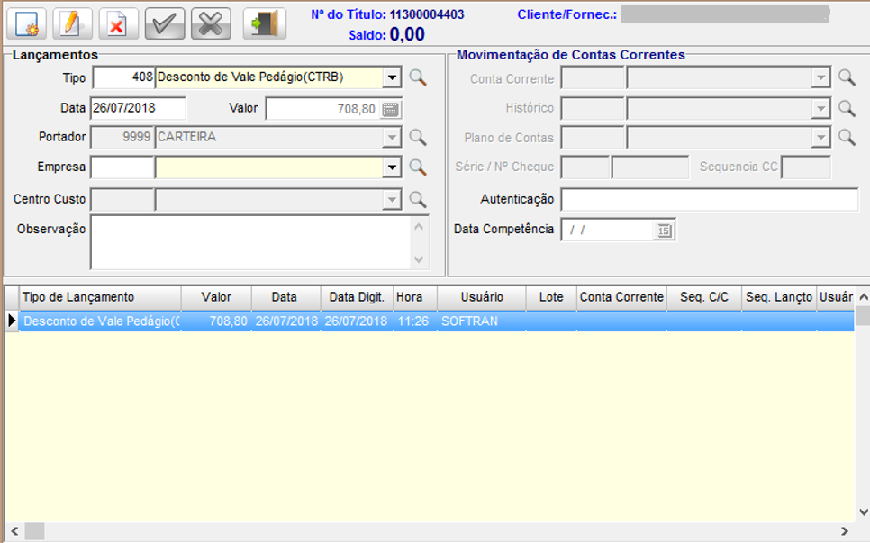 Lançamento financeiro de desconto para o título de pedágio.