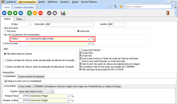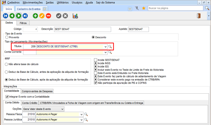Os impostos são gerados automaticamente na geração da CTRB/RPA e após alguma alteração nos eventos do CTRB/RPA. Os impostos são calculados sobre o valor do frete motorista. O IRRF somente é calculado quando a soma dos valores do CTRB/RPA acumulados no mês alcançar o teto para começar a calcular. Seguem abaixo telas que envolvem estes cálculos. Deve ser configurado nestes eventos, movimentação financeira de desconto para o título de Saldo, para descontar este valor a ser pago para o agregado.
