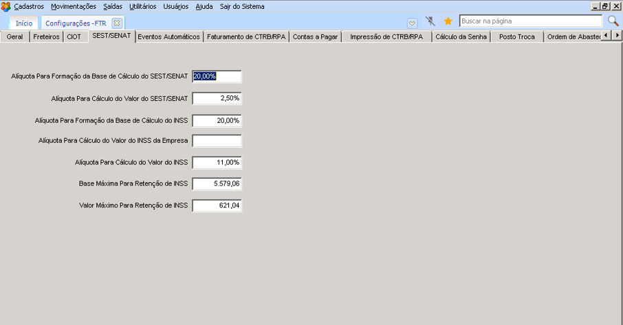 Como configura IRRF, INSS, SEST/SENAT?
