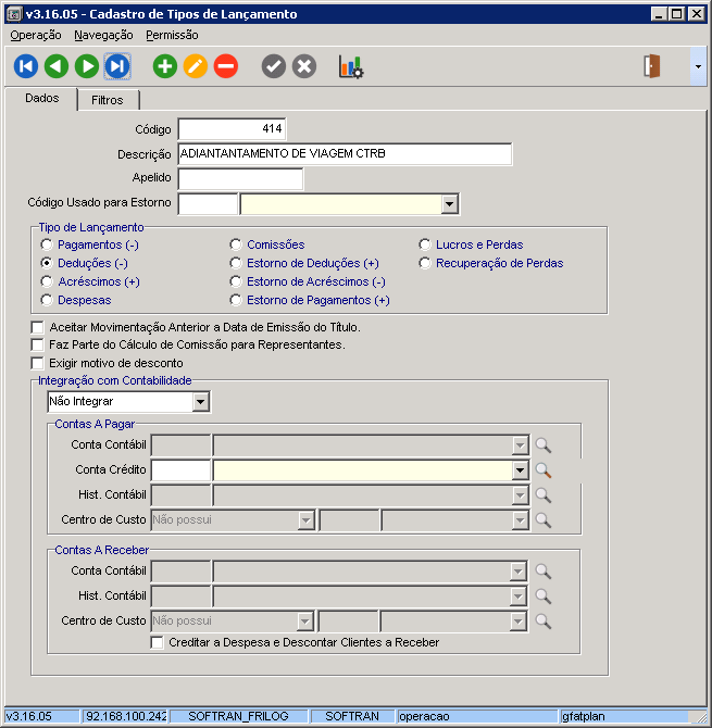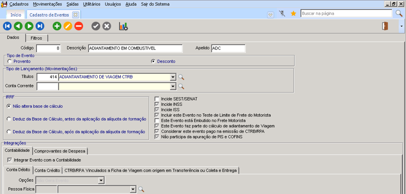 O evento é lançado ao final da viagem antes de realizar o acerto de contas. Este valor atualmente é descontado da fatura e quando possui movimentação financeira de desconto, pois, o motorista recebe na saída do caixa da empresa em espécie este adiantamento.