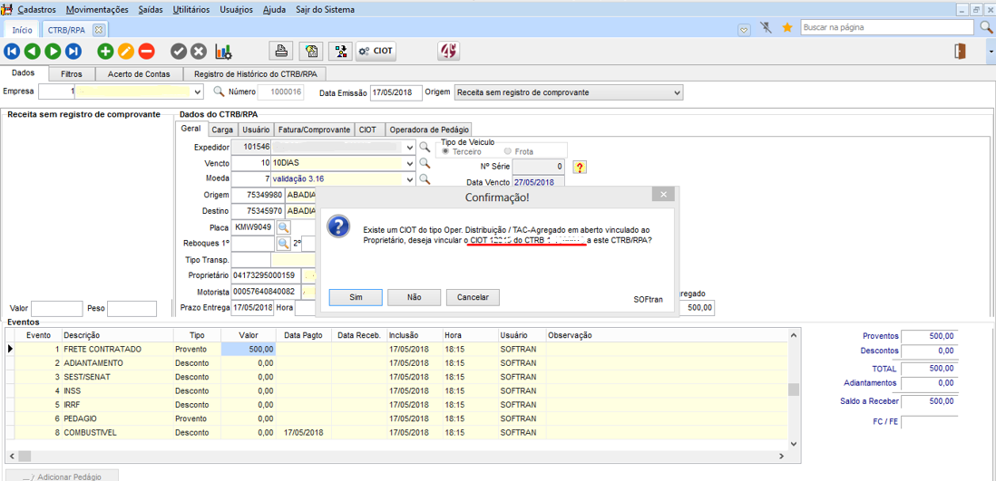 Anteriormente o sistema vinculava automaticamente sem questionar, mas agora para estes casos implementamos o questionamento para que se o usuário deseja vincular a CTRB/RPA ao CIOT que está com status: aberto. Caso usuário pressione “Sim”, vinculará a CTRB/RPA ao mesmo CIOT em aberto e caso pressione “Não”, abrirá a tela de integração com a operadora de pagamento eletrônico para gerar novo CIOT e se caso pressione “Cancelar”, aborta todo o processo.