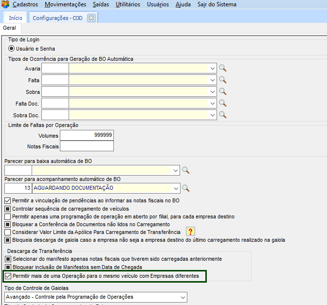 No módulo CFG, em Utilitários > Configurações > TMS > COD – Automação de Depósito, apresenta a configuração Permitir mais de uma Operação para o mesmo veículo com Empresas diferentes.