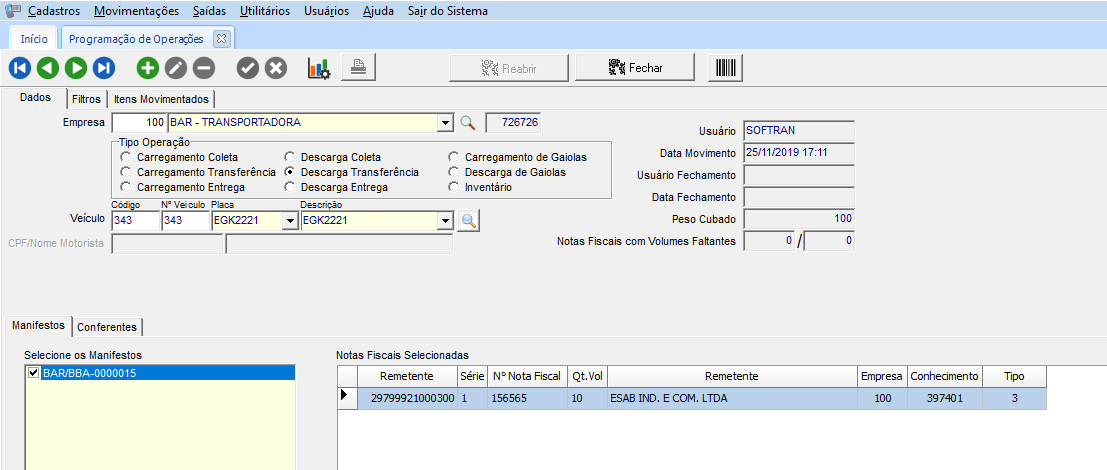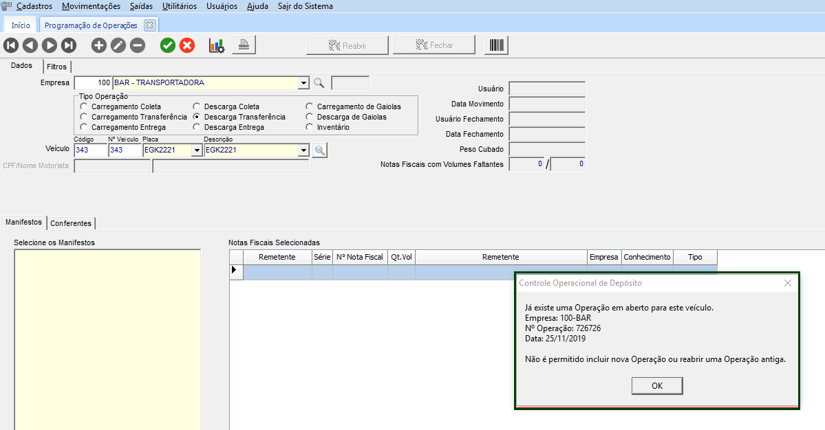 De acordo com a configuração geral do módulo marcada, realizado um novo cadastro de operação Descarga Transferência para o mesmo veículo, apenas com empresa diferente. O sistema permite para empresas diferentes, porém não permite usar o mesmo manifesto em mais uma operação aberta.