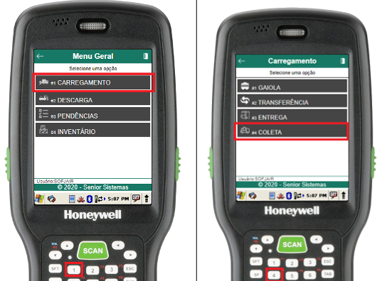 Na rotina de selecionar veículo, basta informar a placa do veículo a ser carregado (através do scanner de código de barras ou digitação). Se o veículo estiver aberto e cadastrado para o usuário em questão, o menu de carregamento de coleta do veículo será aberto, caso contrário, um erro será exibido.