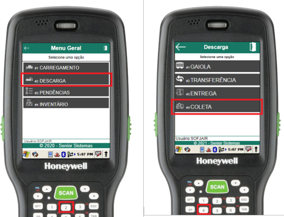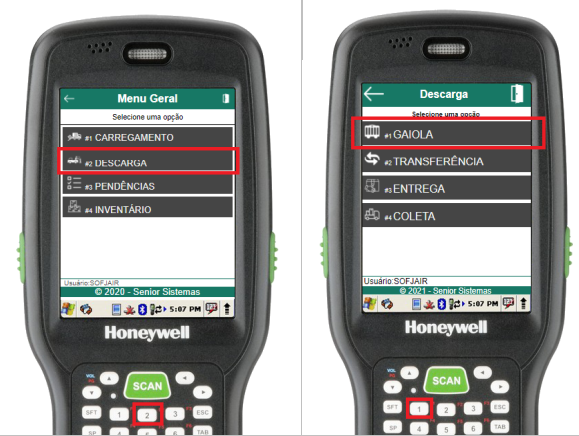 Na rotina de selecionar gaiola, basta informar o número da gaiola (através do scanner de código de barras ou digitação). Se a gaiola estiver aberta e cadastrada para o usuário em questão, o menu de descarga da gaiola será aberto, caso contrário, um erro será exibido.