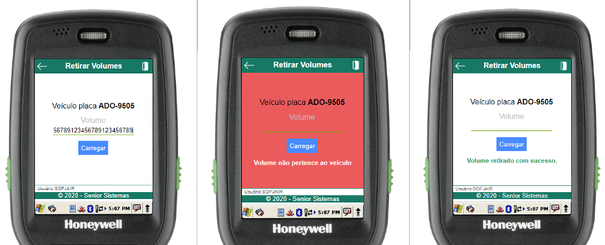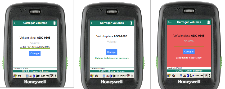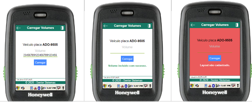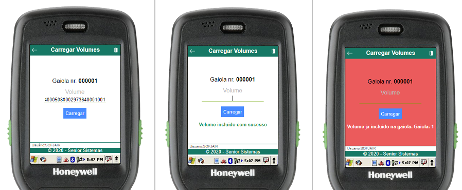 Dentro da rotina de carregamento, para iniciar o carregamento basta informar o código de barras do volume (através do scanner de código de barras ou digitação). Uma mensagem será exibida informando se a operação foi bem-sucedida, assim como um efeito sonoro específico.