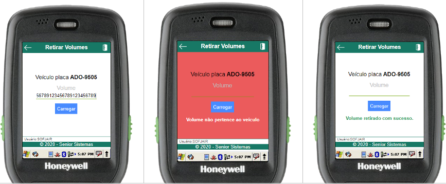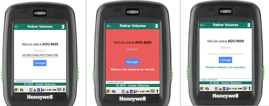 Dentro da rotina de retirada, para retirar um volume do veículo selecionado basta informar o código de barras do volume (através do scanner de código de barras ou digitação). Uma mensagem será exibida informando se a operação foi bem-sucedida, assim como um efeito sonoro específico.