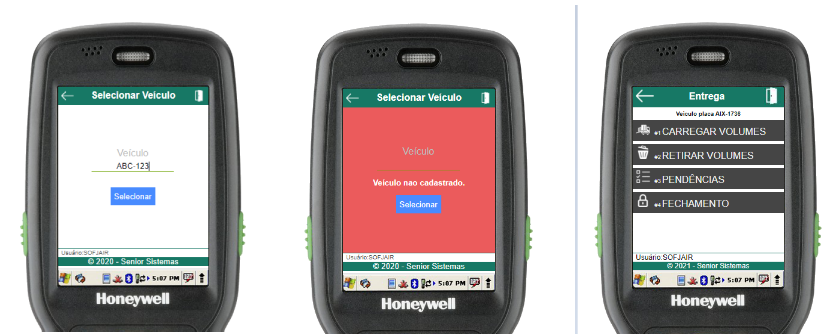 Na rotina de selecionar veículo, basta informar a placa do veículo a ser carregado (através do scanner de código de barras ou digitação). Se o veículo estiver aberto e cadastrado para o usuário em questão, o menu de carregamento de entrega do veículo será aberto, caso contrário, um erro será exibido.