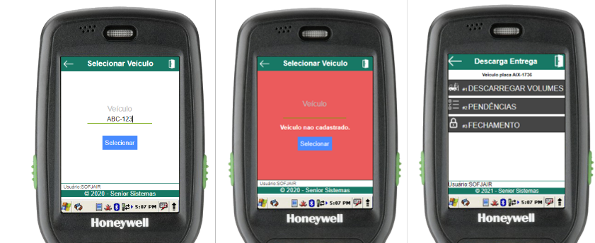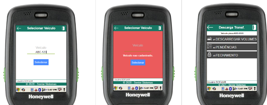 Na rotina de selecionar veículo, basta informar a placa do veículo a ser descarregado (através do scanner de código de barras ou digitação). Se o veículo estiver aberto e cadastrado para o usuário em questão, o menu de descarga do veículo será aberto, caso contrário, um erro será exibido.
