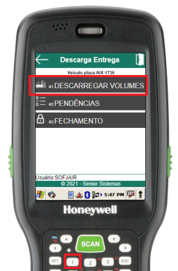 Para descarregar os volumes de entrega do veículo, através do menu “Descarga de Entrega”, deve-se selecionar a opção Descarregar Volumes (atalho 1).