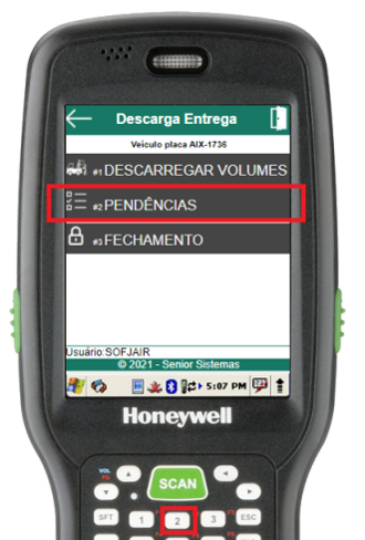 Para conferir os volumes pendentes em uma descarga de entrega, deve-se acessar a rotina de pendências através do item 2 do menu de descarga da entrega.