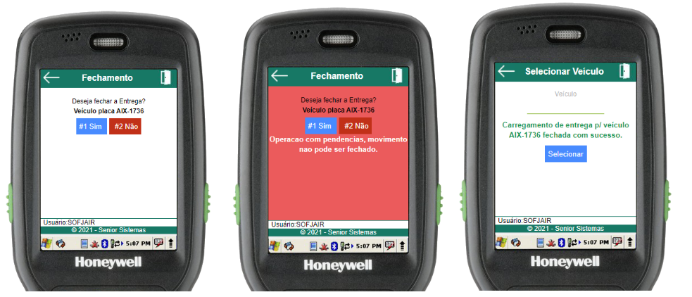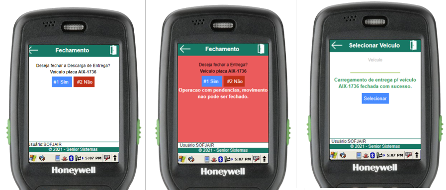 Para confirmar o fechamento, basta selecionar o botão “Sim” ou utilizar a tecla de atalho “1” no menu numérico. Caso a opção “Sim” seja escolhida e for possível fechar o carregamento de entrega, o usuário será redirecionado à tela de seleção de veículo, onde será exibida a mensagem de operação bem-sucedida, caso não seja possível, uma mensagem de erro será exibida. Se o botão “Não” for selecionado, o usuário será redirecionado para o menu de carregamento de entrega em questão.