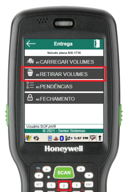 Caso algum volume seja carregado no veículo em questão de forma equivocada, a rotina de retirar “Retirar Volumes” pode ser utilizada através do segundo item do menu “Carregar Entrega”.