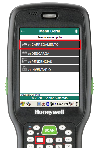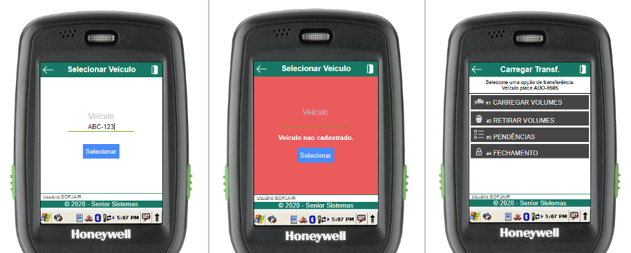 Na rotina de selecionar veículo, basta informar a placa do veículo a ser carregado (através do scanner de código de barras ou digitação). Se o veículo estiver aberto e cadastrado para o usuário em questão, o menu de carregamento do veículo será aberto, caso contrário, um erro será exibido.