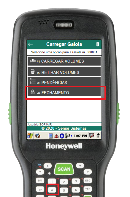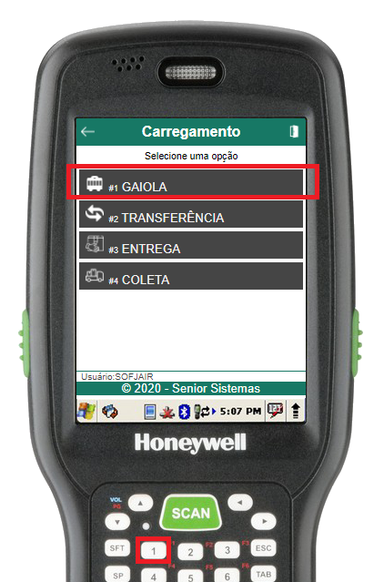 Na rotina de selecionar gaiola, informe o número da gaiola (através do scanner de código de barras ou digitação). Se a gaiola estiver aberta e cadastrada para o usuário em questão, o menu de carregamento da gaiola será aberto, caso contrário, um erro será exibido.