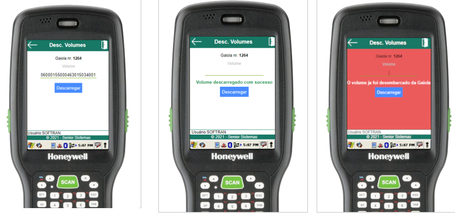 Dentro da rotina de descarga, para iniciar a descarga basta informar o código de barras do volume (através do scanner de código de barras ou digitação). Uma mensagem será exibida informando se a operação foi bem-sucedida, assim como um efeito sonoro específico.