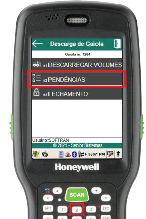Para conferir os volumes pendentes em uma descarga de gaiola, deve-se acessar a rotina de pendências através do item 2 do menu de descarga da gaiola.