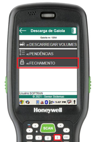 Ao não existirem mais pendências, o usuário poderá executar a rotina de fechamento de descarga da gaiola através do item 3 do menu de descarga de gaiola.