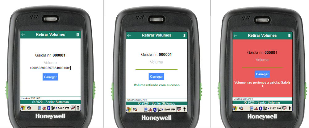 Dentro da rotina de retirada, para retirar um volume da gaiola selecionada basta informar o código de barras do volume (através do scanner de código de barras ou digitação). Uma mensagem será exibida informando se a operação foi bem-sucedida, assim como um efeito sonoro específico.