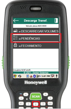 Para conferir os volumes pendentes em uma descarga de transferência, deve-se acessar a rotina de pendências através do item 2 do menu de descarga da transferência.
