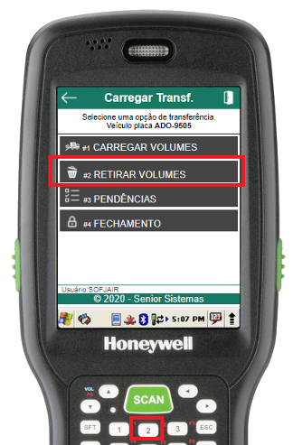 Para carregar os volumes de transferência no veículo, através do menu “Carregar Transferência”, deve-se selecionar a opção Carregar Volumes (atalho 1).