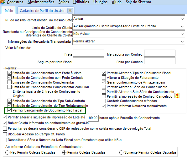 Quando a configuração do perfil do usuário estiver desmarcada, o sistema não apresenta a opção de marcar como documento não fiscal.