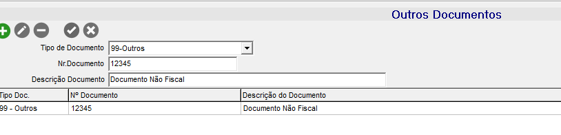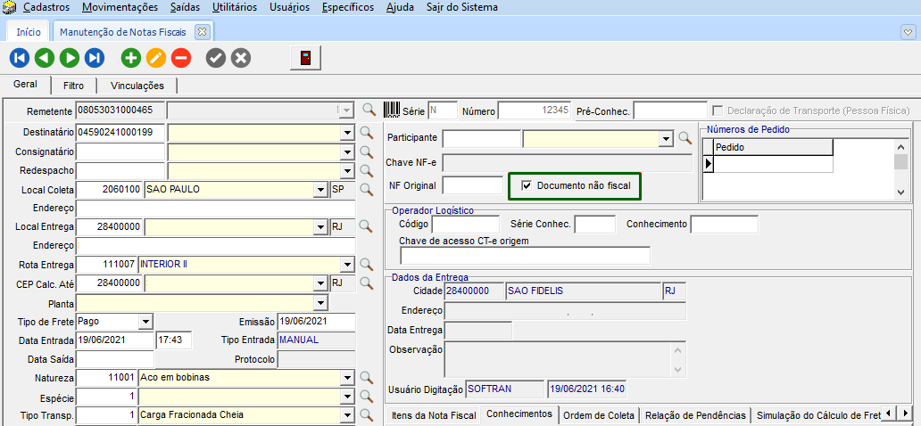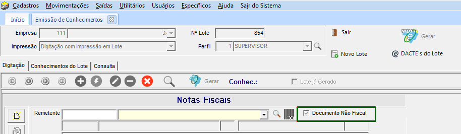 Quando o usuário tiver permissão para adicionar documentos não fiscais, na tela de Manutenção de Notas Fiscais será apresentada a mesma informação. Para as notas que foram geradas pela tela da emissão do conhecimento, com esta opção marcada e não permite alteração, quando tem conhecimento vinculado.