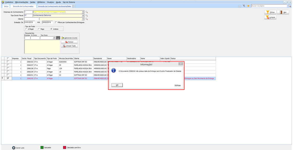 Em Movimentações > Conhecimentos > Emissão de Conhec. De Estadia/Diária, filtre os conhecimentos conforme necessidade. Quando o conhecimento estiver sem registro de movimento de entrega, será apresentada a informação de acordo com seu status. Também não será permitido realizar a geração do lote quando não tiver um movimento que finalize o processo da estadia.