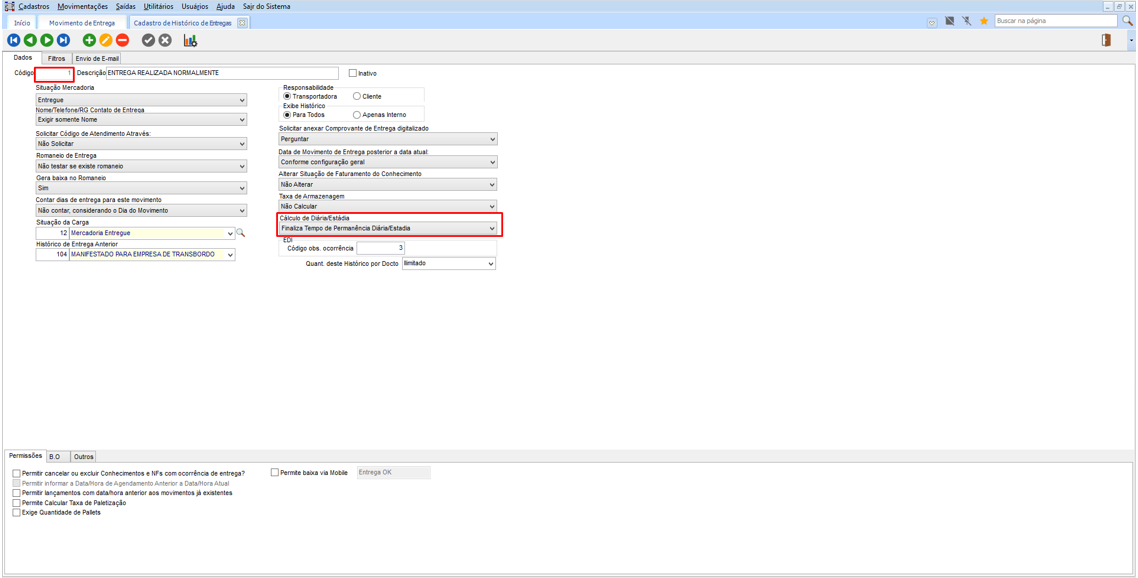 O histórico da entrega precisa ser configurado com a opção do cálculo de diária/estadia que “Finaliza Tempo de Permanência Diária/Estadia”.