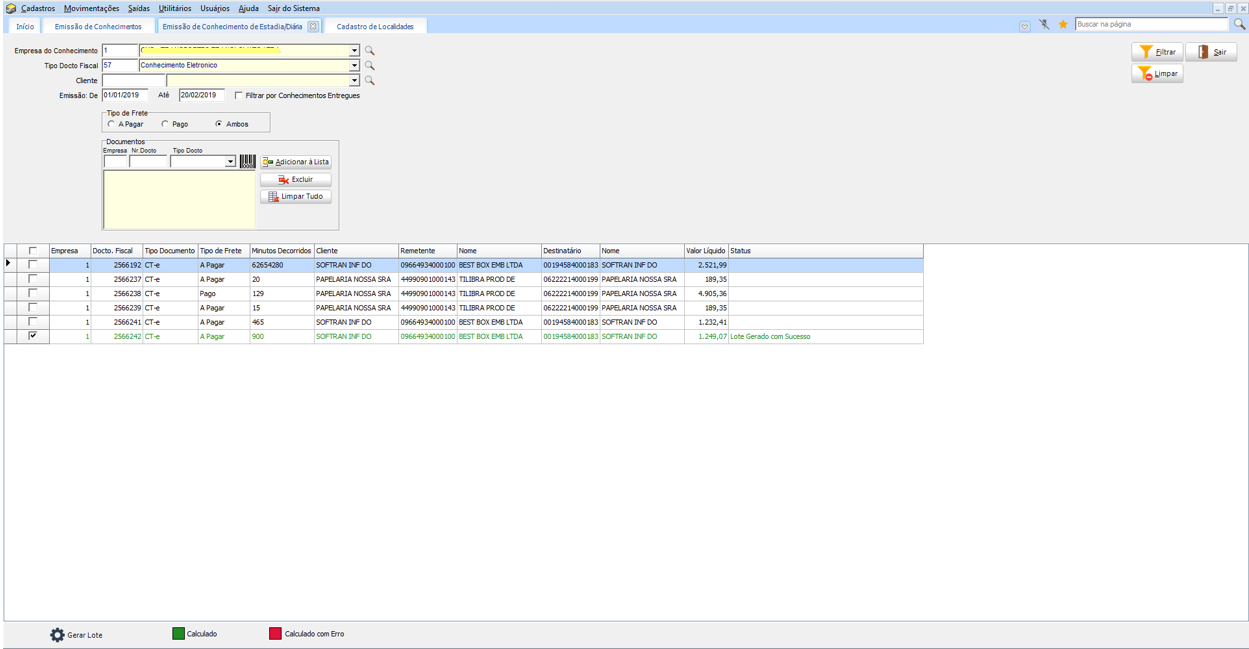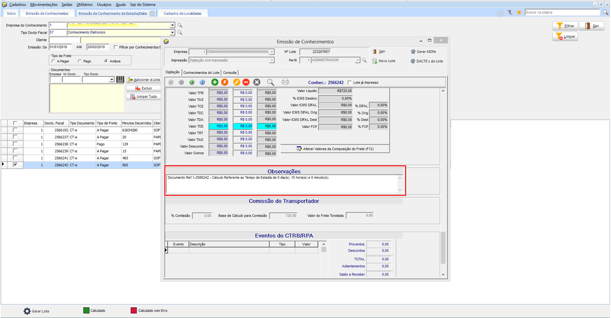 No processo, a rotina verifica se o cliente do documento tem uma Tabela de Diária ou se a Empresa está configurada com a Tabela de Diária. Sendo assim utilizamos essa tabela para calcular os minutos e gerar o valor do Frete. Então assim que calcular o Frete, os documentos cujos os valores forem maior que zero serão criados um Lote de Emissão, para que se faça a impressão do documento e geração do CT-eou NFS/NFSe.