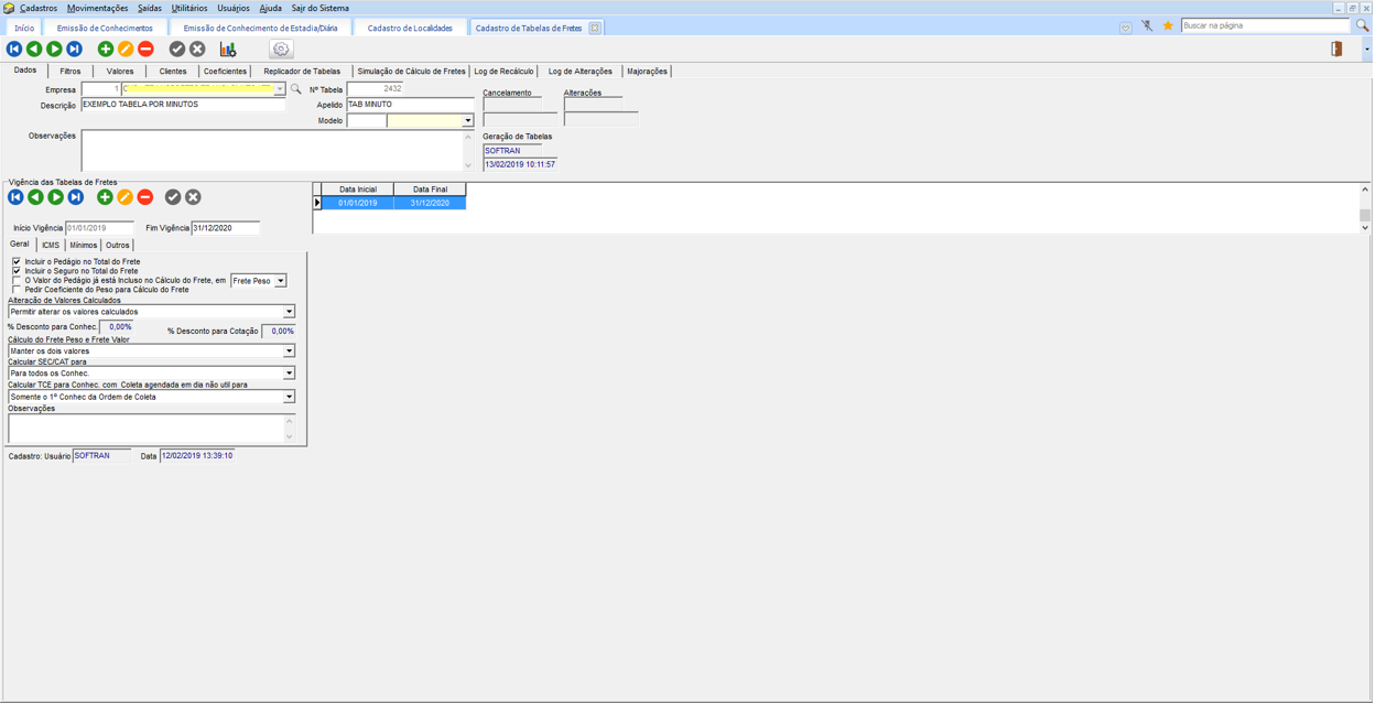 - No módulo CCE no menu Cadastros > Tabelas de Frete > Formatos de Tabela de Frete, deve ser cadastrado o formato da Tabela de Frete, onde o tipo deve ser igual a Tabela tempo (Min/Horas). Em Informações que Compõe a Tabela de Frete, a condição Se deve estar como QT.Minutos\horas e o Campo de Ref deve estar como Qt. Minuto(Minuto/hora). E em Cadastros > Tabelas de Frete > Tabelas de Frete Pré-Formatadas criar uma Tabela de Frete da diária com o novo formato.
