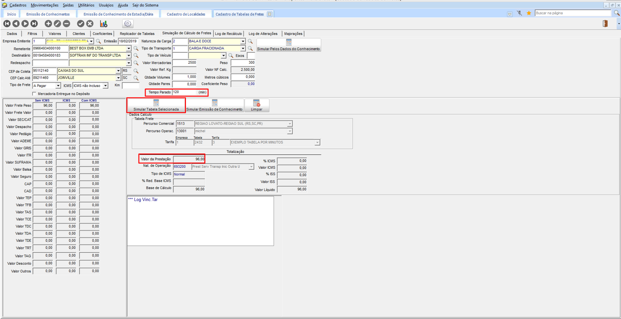 Para simular o cálculo, na guia Simulação de Cálculo de Fretes, seleciona o conhecimento gerado e informa o Tempo Parado (em minutos).