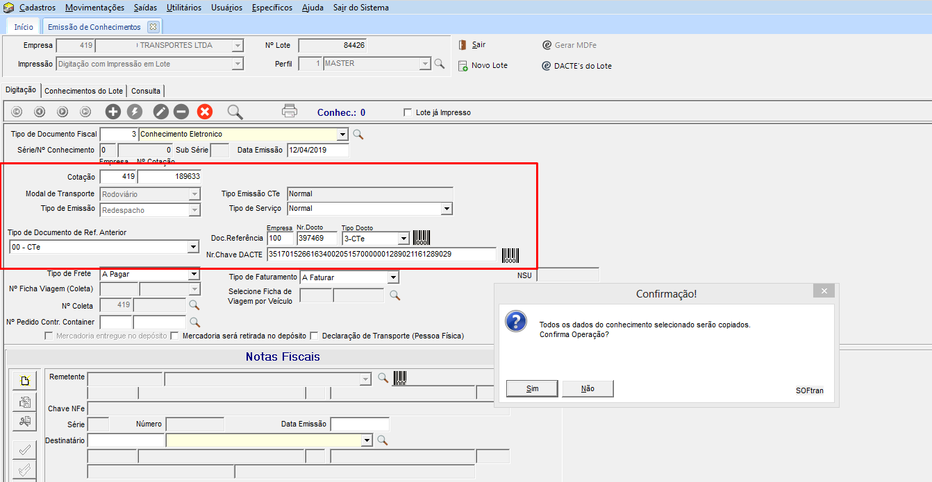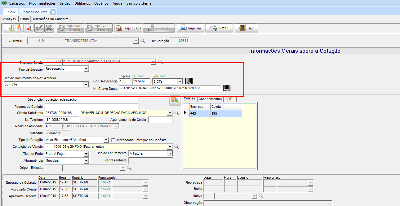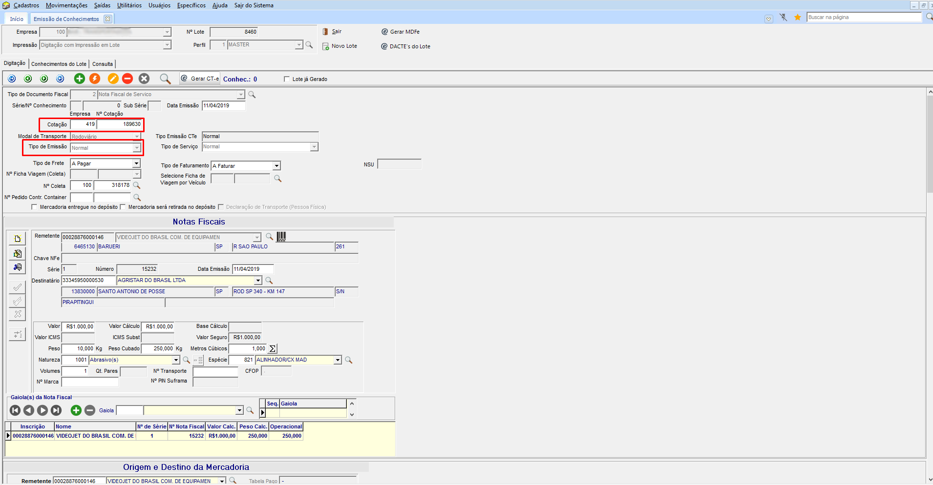 Ao selecionar a mesma cotação na emissão do conhecimento, o sistema busca os dados do documento de referência, da mesma forma como está na cotação.