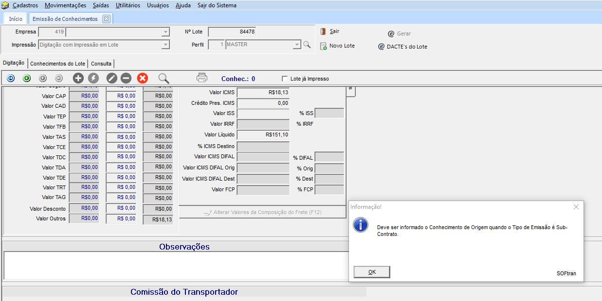 Para a cotação do Tipo de emissão SubContrato, o sistema exige o preenchimento do campo Nr. Chave Dacte, com o conhecimento de origem.