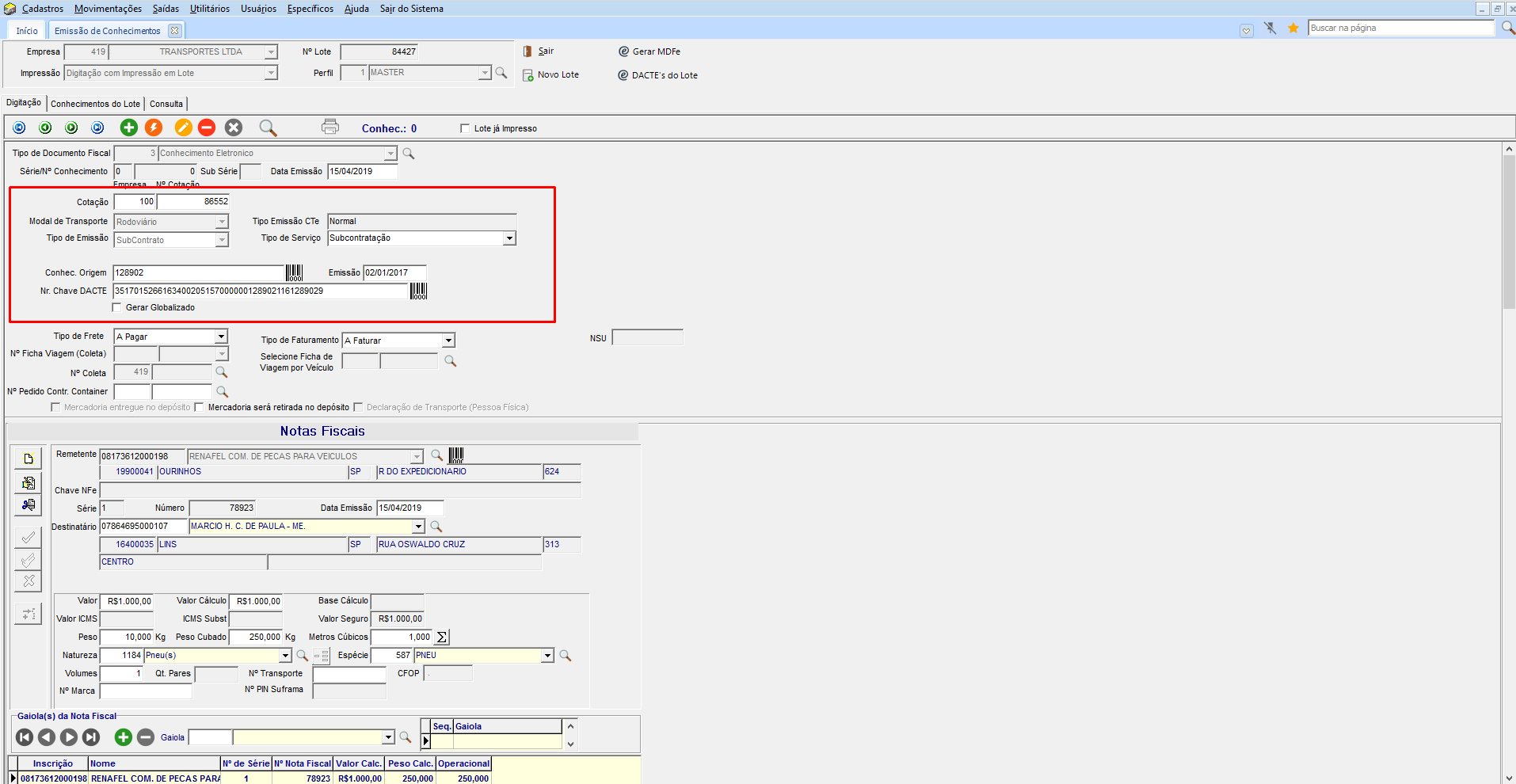 Os dados da emissão do conhecimento, serão preenchidos de acordo com a cotação de subcontratação cadastrada.