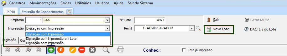 - Digitação com Impressão em Lote: a rotina irá aguardar todos os documentos serem digitados, aguardando o usuário enviar para a impressora para serem gerados a numeração e envio no final manualmente.