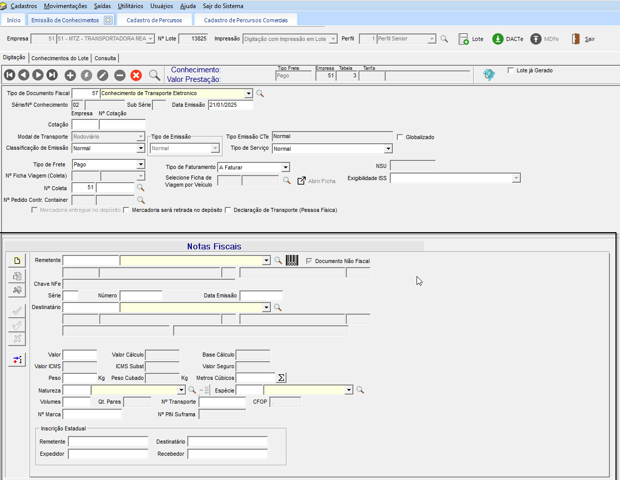 No cadastro da emissão do conhecimento, não tem necessidade de nota fiscal ou documento de referência.