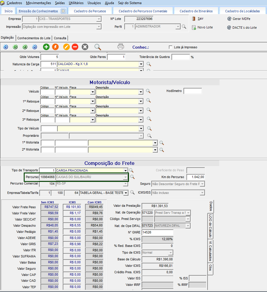 Verifique os percursos em Cadastros > Logística > Percursos