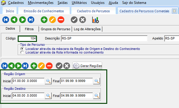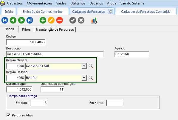 Estas regiões de Origem/Destino do percurso operacional, estão vinculadas nas regiões do cadastro do percurso comercial, em Cadastros > Tabelas de Frete > Percursos Comerciais.