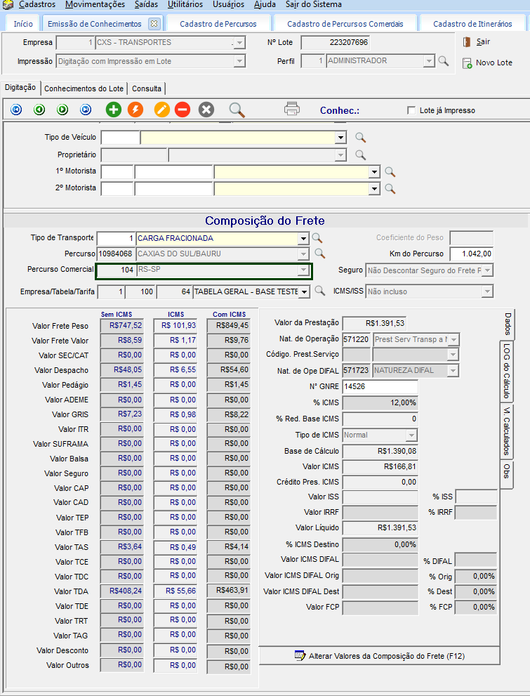 Desta forma, o percurso comercial será incluso na Tabela de Frete, de acordo com as informações da tarifa configurada para calcular os valores, vistos em Cadastros > Tabelas de Frete > Tabelas de Frete Pré-Formatadas.