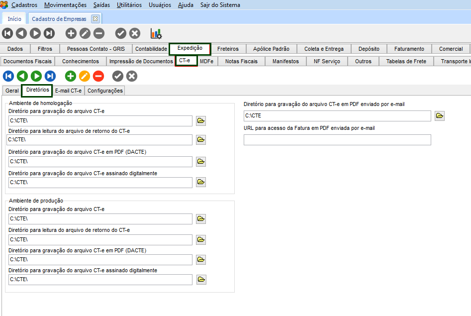 - CFG > Cadastros > Empresas > guia Expedição > guia Tabelas de Frete